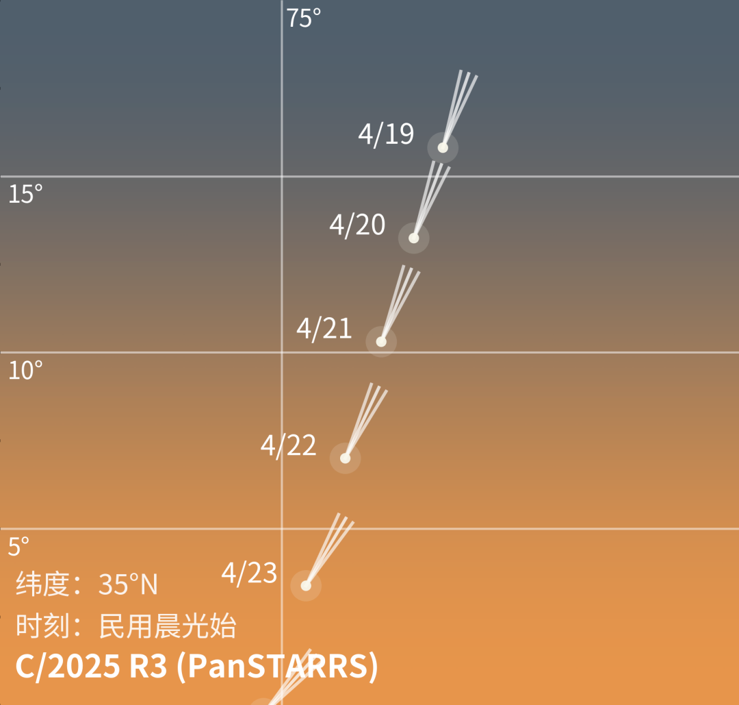 4月19日至24日,民用晨光开始时(约日出前30分钟),彗星C/2025 R3的地平方位及高度 图据北京天文馆