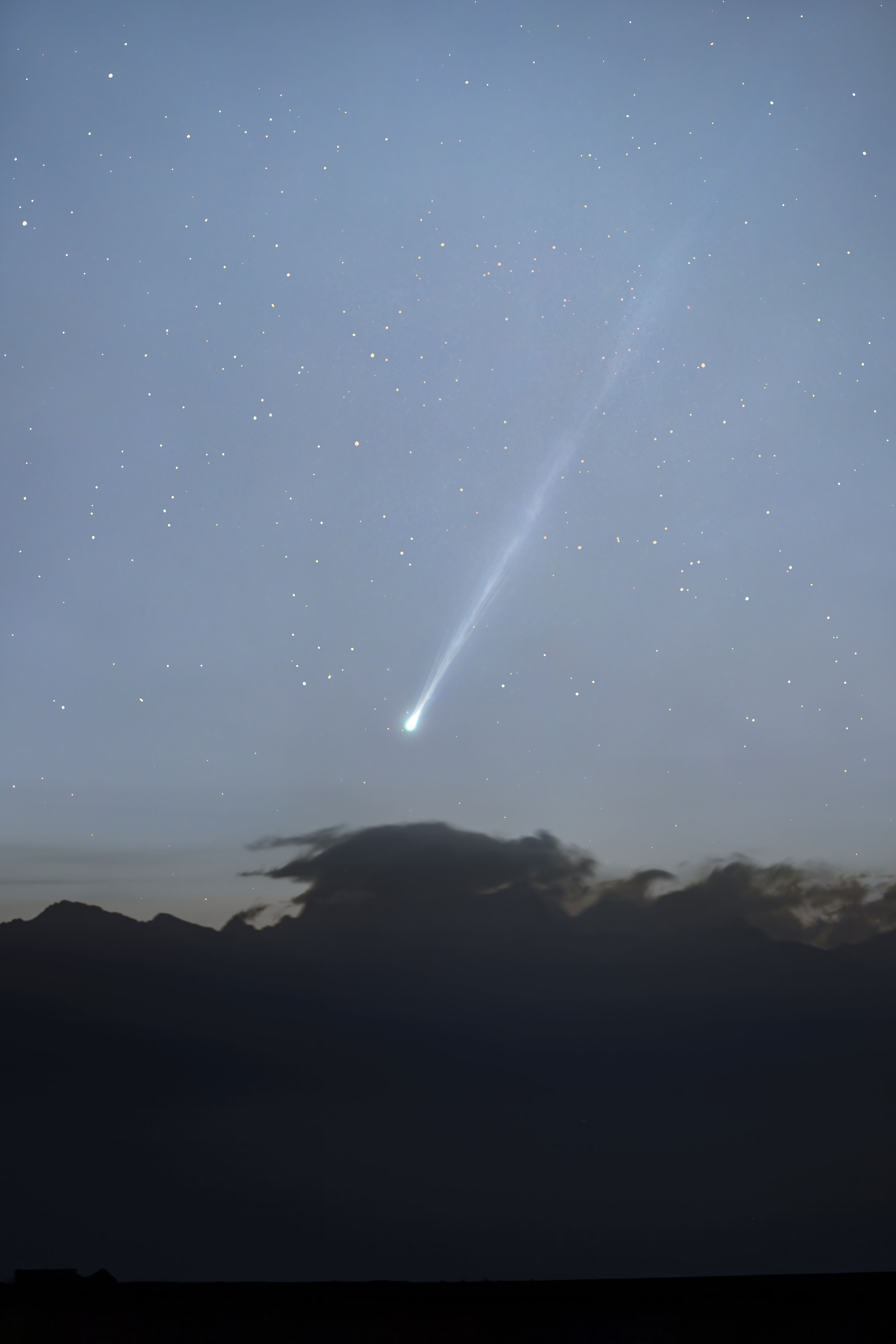 封面新闻记者4月18日从北京天文馆获悉,2025年被发现的彗星C/2025 R3将于北京时间4月20日早晨通过近日点。这颗来自太阳系边缘的“信使”,轨道周期长达16-17万年,观测窗口只有4月,不少人已经拍到了它的身影。摄影师杨雳鹏4月14日在新疆乌鲁木齐南山守候整夜,拍到了它拖着长尾巴的身影,“今年可观测的彗星不多,R3可以说是2026年最靠谱的彗星,我准备19日再去拍摄一次。”杨雳鹏告诉封面新闻记者,R3彗星升起落下时间与太阳基本同步,适合拍摄的时间差不多只有一个小时,要找日出前光线较暗的时间最出片。